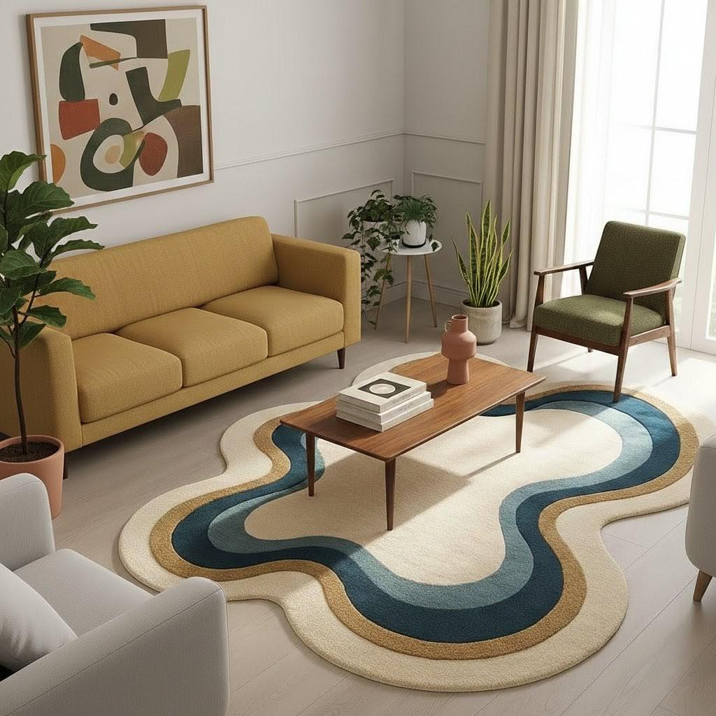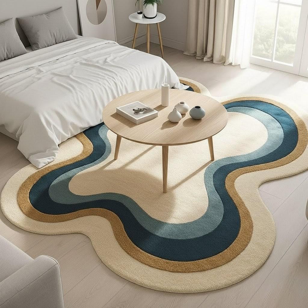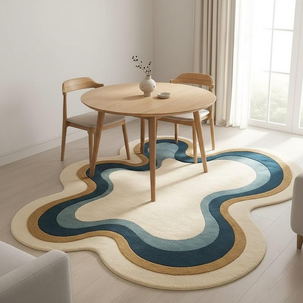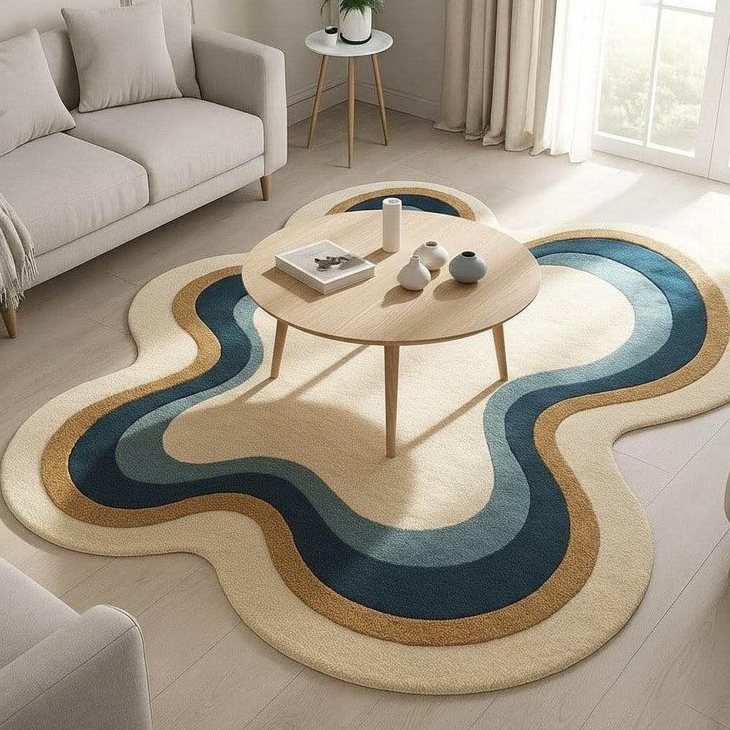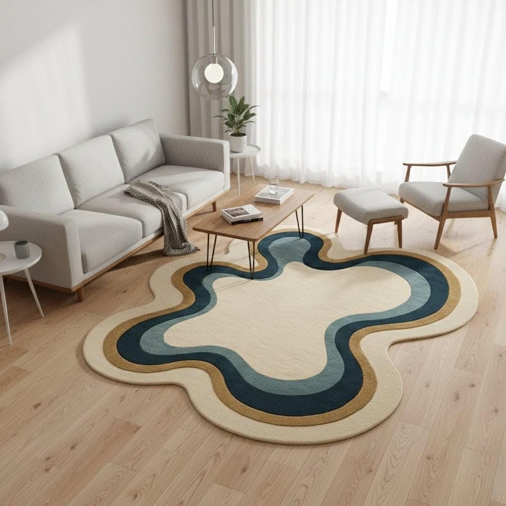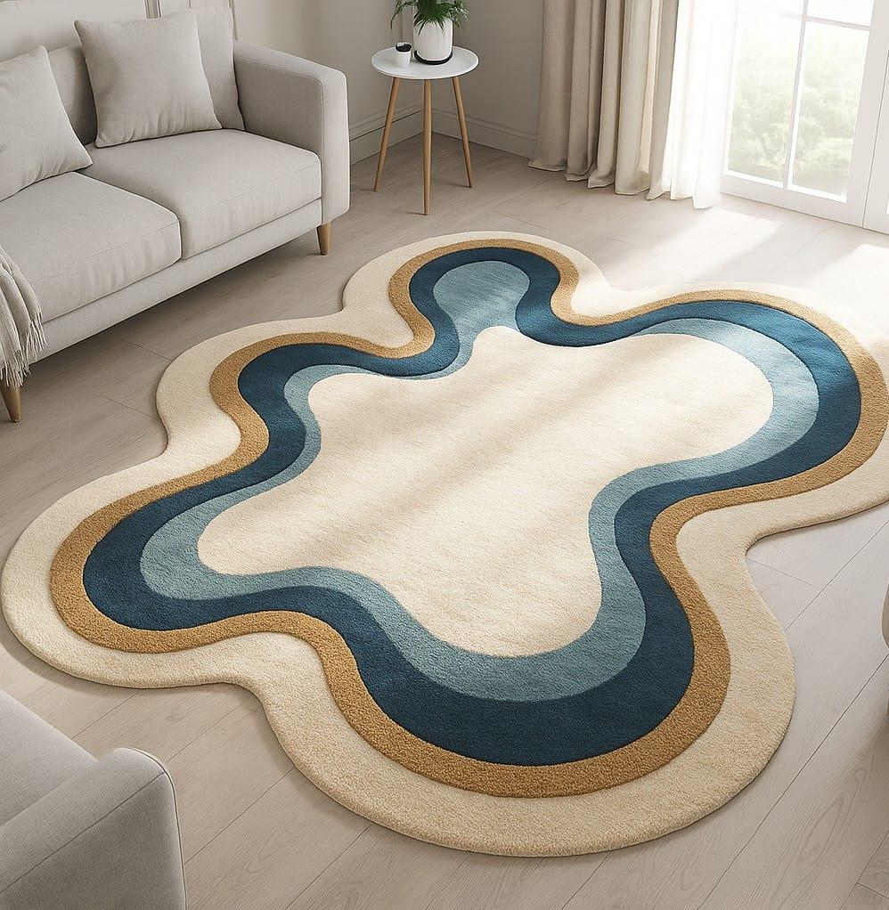 Aesthetic Wavy Rug | Groovy Blue & Cream Area Rug | Handmade Wave Pattern Carpet for Living Room, Bedroom and Office| Modern Boho Home Décor