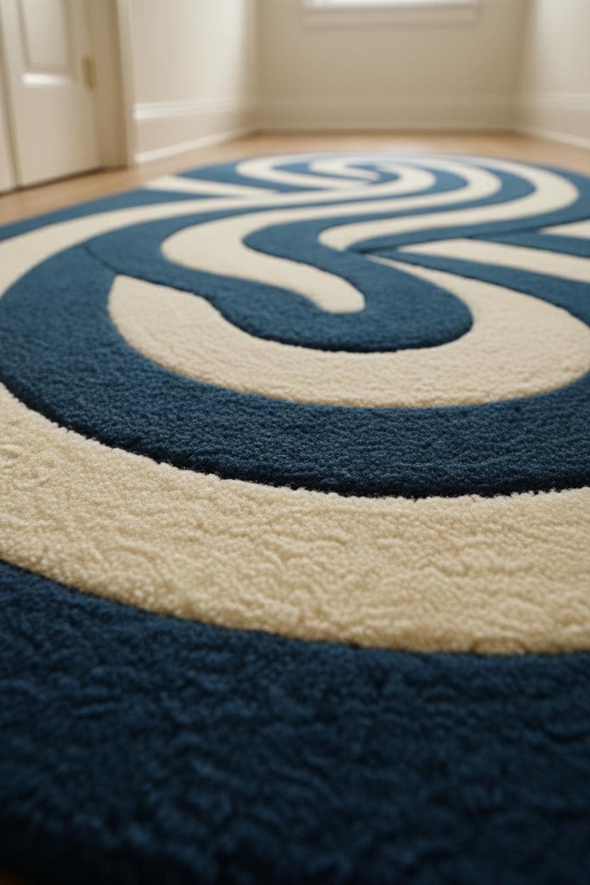 This modern abstract runner rug features a bold wavy design in calming blue and soft white tones. Hand-tufted with premium wool, it adds depth, movement, and luxury to narrow hallways, corridors, and entryways.