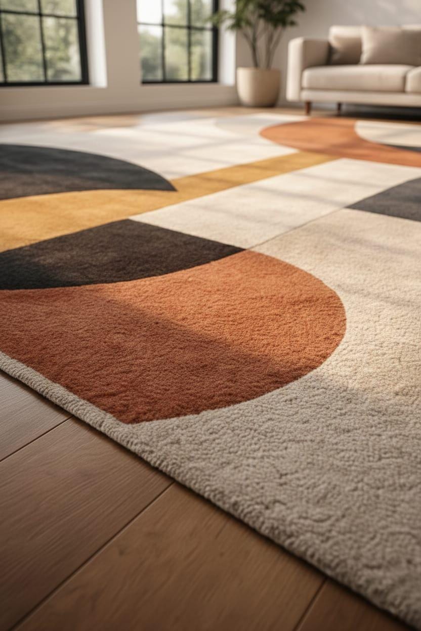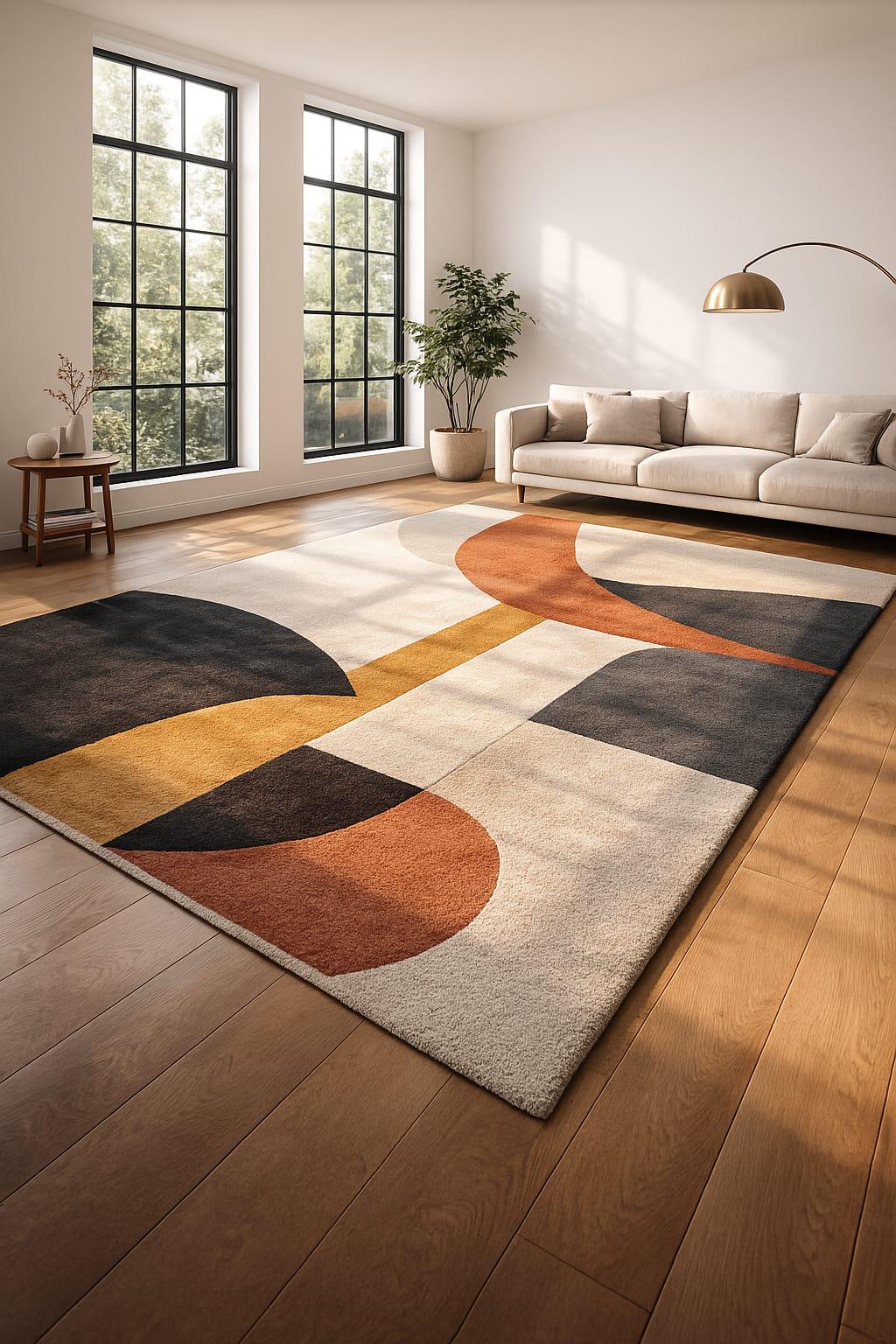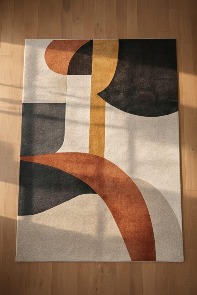 This handmade abstract geometric wool rug blends soft neutrals with bold curved shapes, creating a calm yet artistic statement for your home. The beige base paired with black, rust, and mustard tones makes it perfect for modern, minimalist, or contemporary interiors.