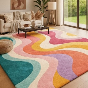 Hand Tufted Abstract Circle Wool Rug, Modern Pastel Area Carpet, Soft Plush Living Room Rug, Custom Size Handmade Rug