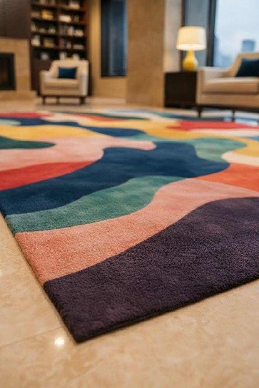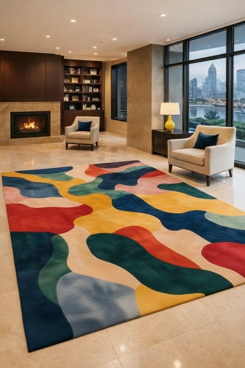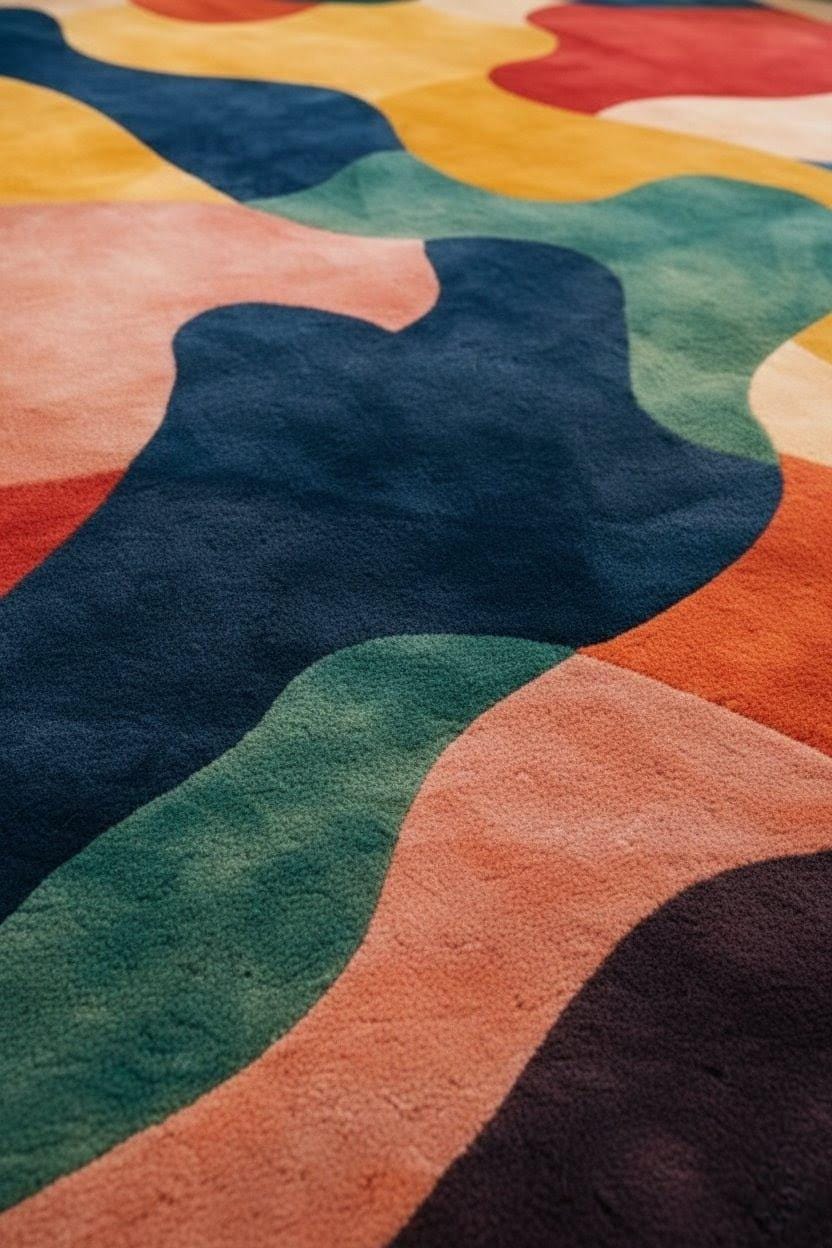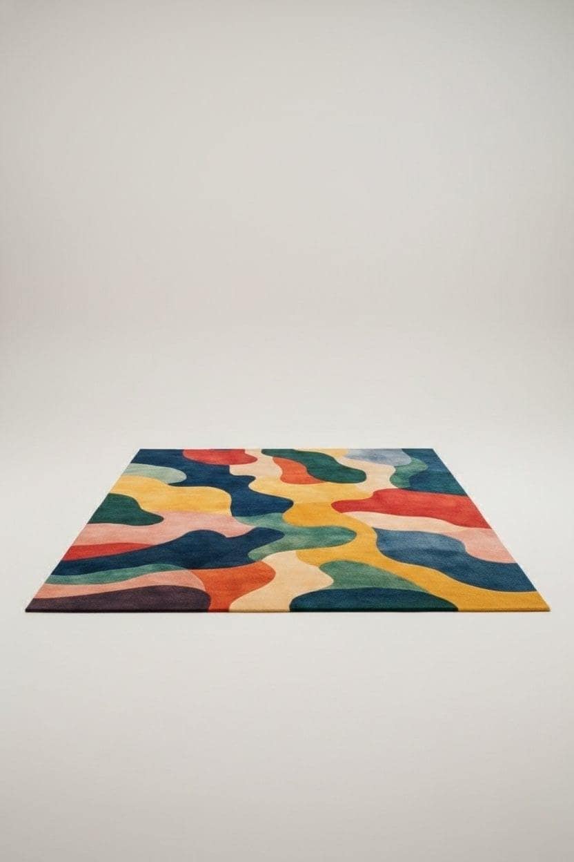 This modern abstract area rug features flowing organic shapes with bold yet balanced colors, perfect for stylish homes.