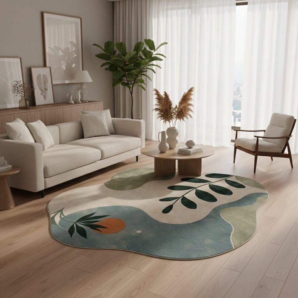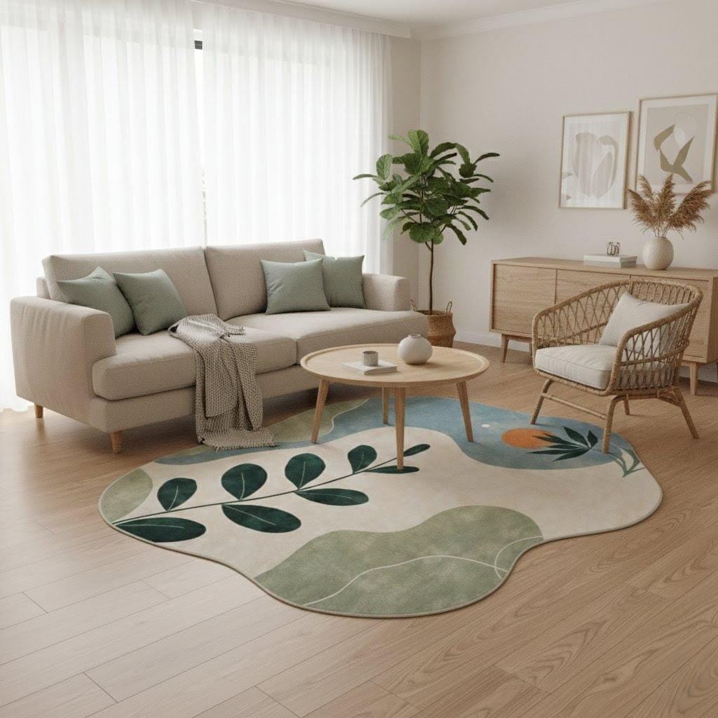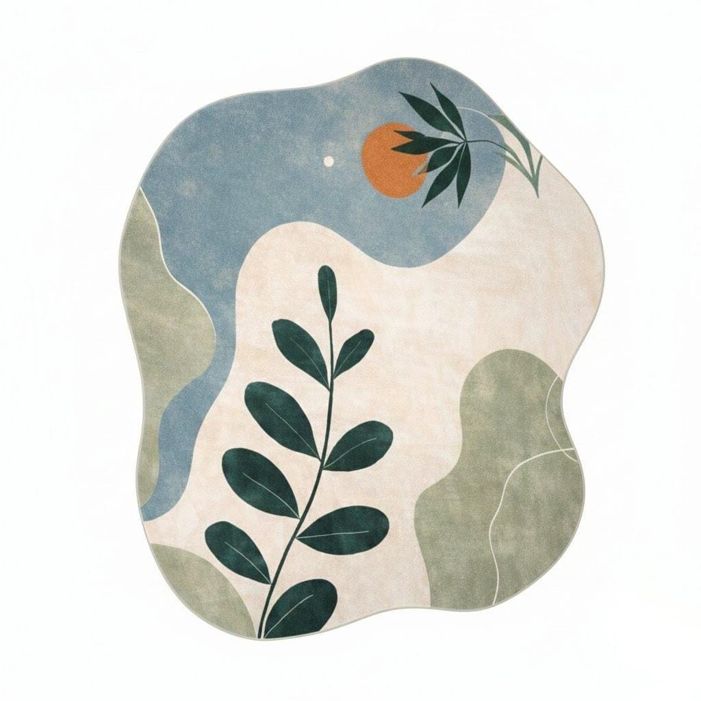Soft flowing organic shapes, soothing sage green, muted blue, and warm beige tones create a peaceful atmosphere that instantly upgrades your living room, bedroom, or studio.