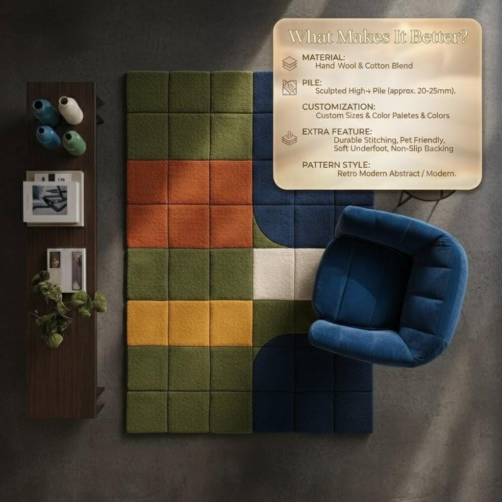 • Size: Any dimensions available — from small bedside mats to large living room carpets.