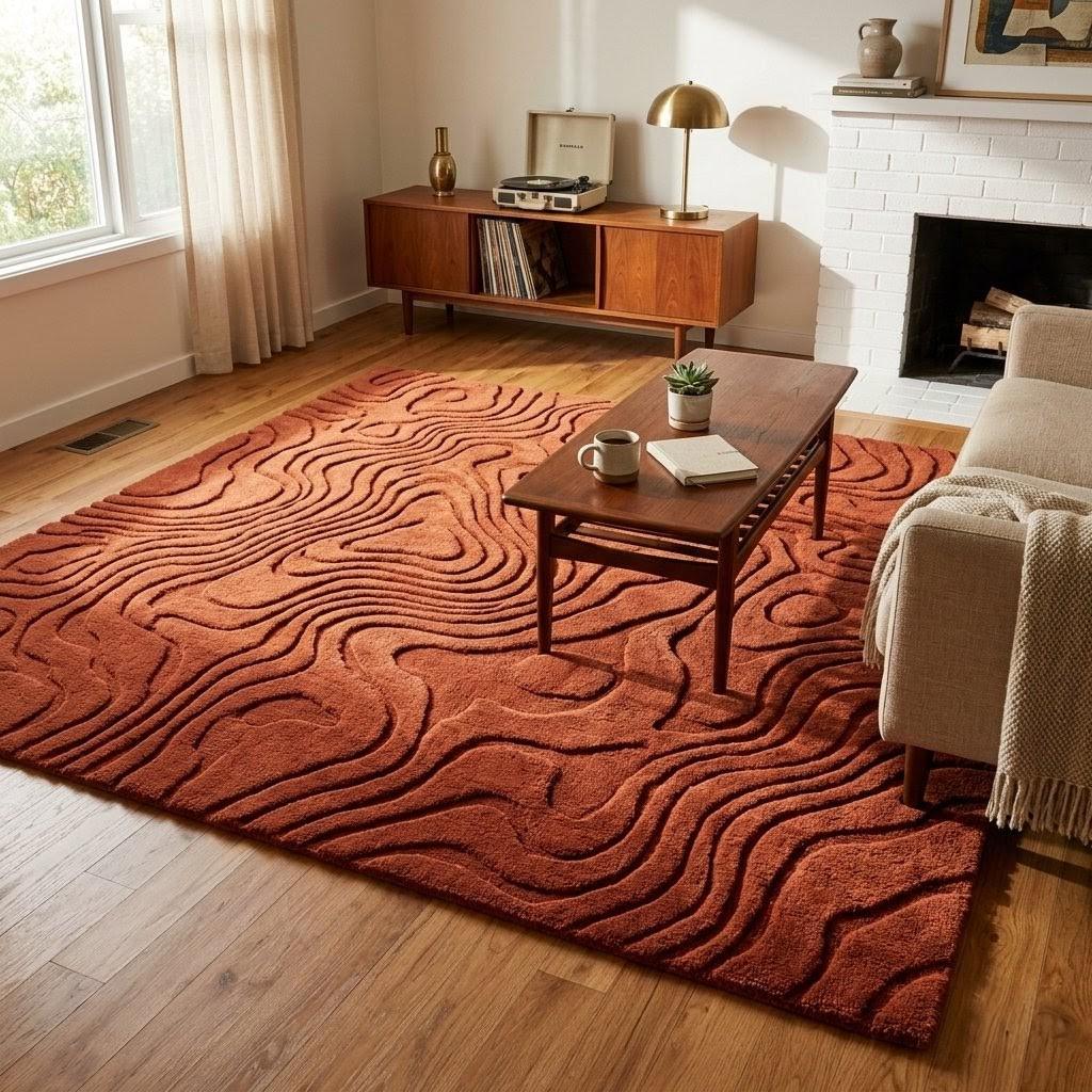 ​Inspired by the organic contours of earth’s landscapes, this rug features a sophisticated "topographic map" design. The rich rust-orange hue and flowing carved lines make it a perfect anchor for Mid-Century Modern, Minimalist, or Boho-Chic interiors looking for a bold, architectural statement.