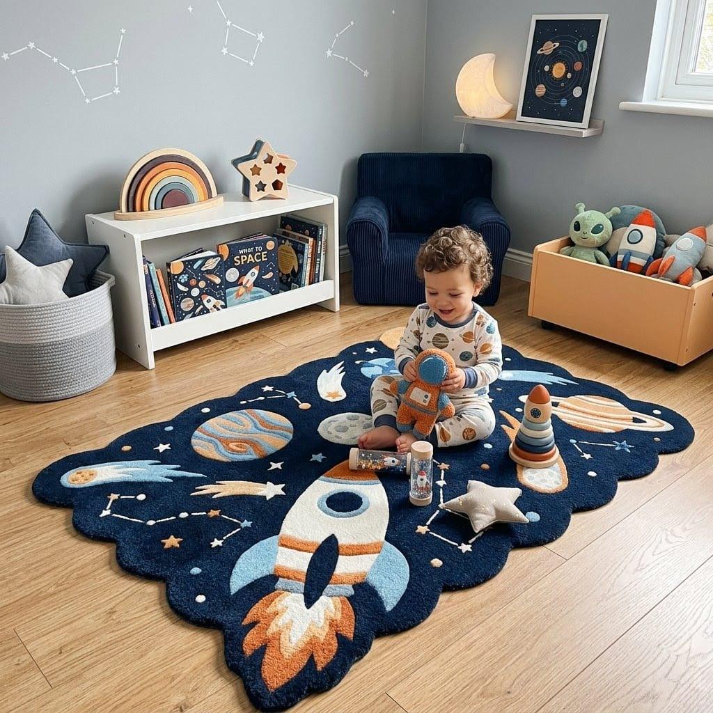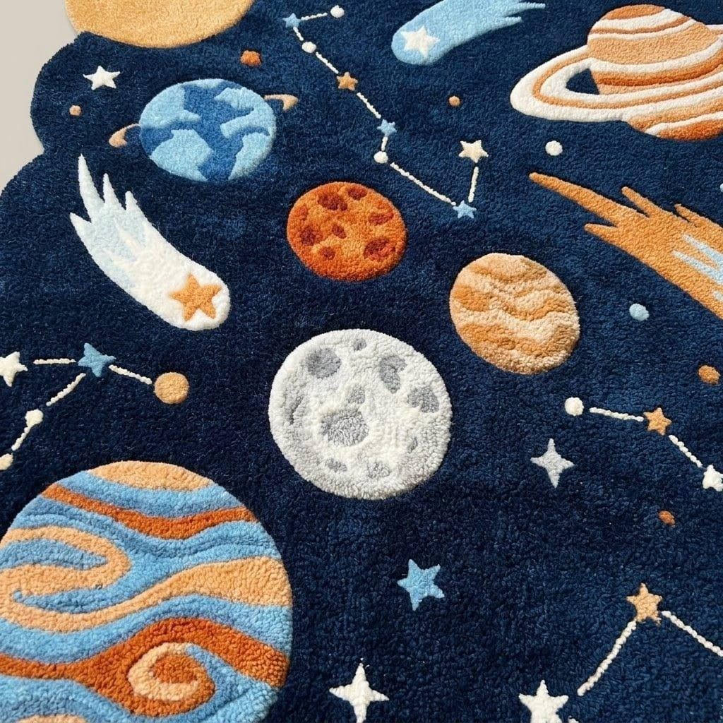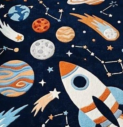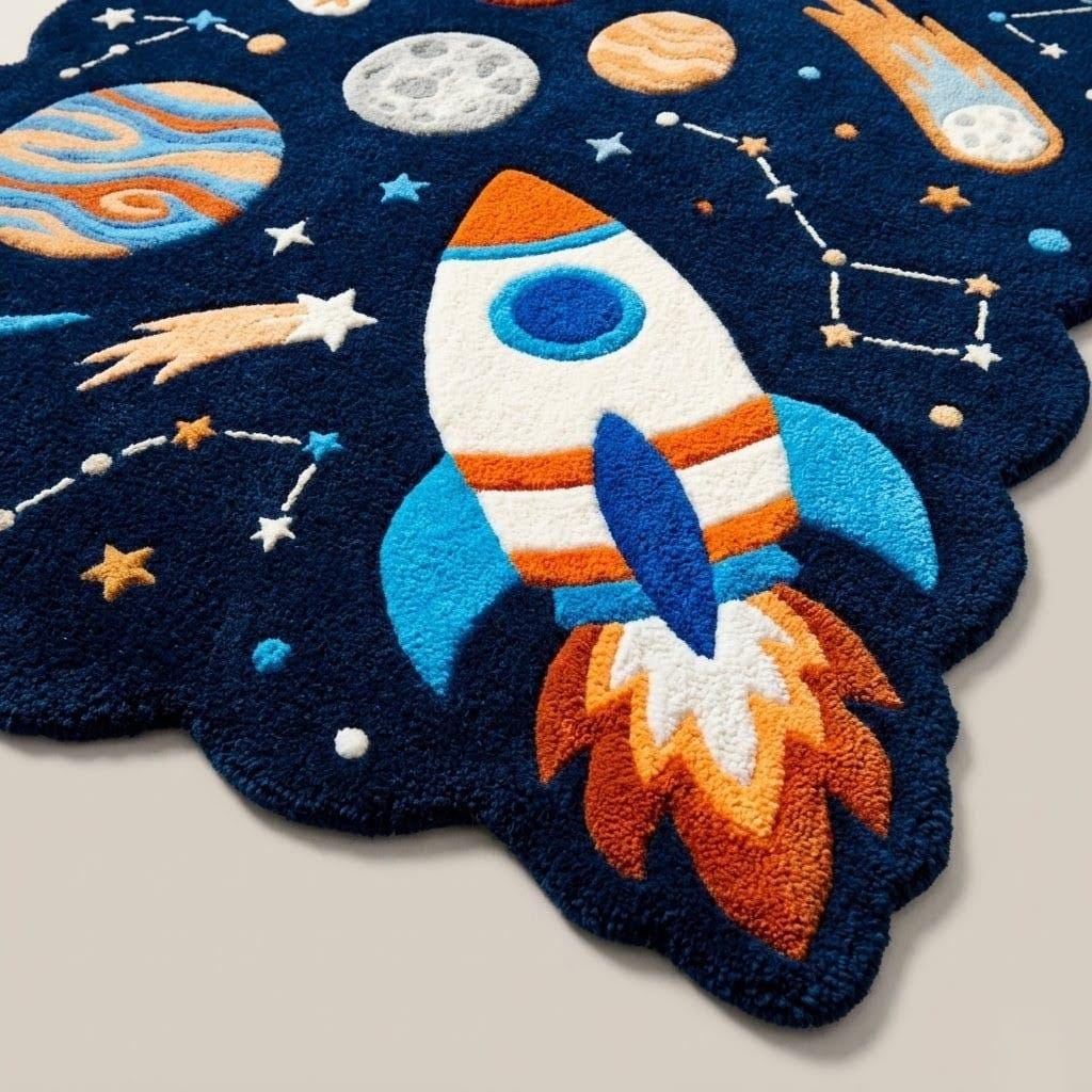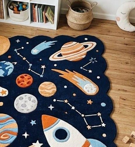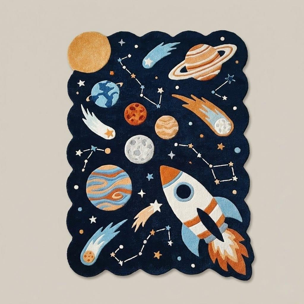 Fuel your little astronaut's imagination with this stunning Hand-Tufted Rocket Ship Rug. Featuring a unique scalloped border and a vibrant galaxy of planets, this plush wool carpet is the ultimate statement piece for any nursery or playroom. Soft, durable, and out-of-this-world—perfect for a dreamy celestial-themed space!